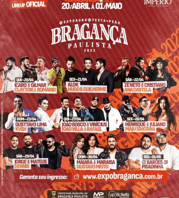 A vencedora da Concorrência Pública nº 001/2023 para a realização do evento é a empresa MDPM Promoções Artísticas Ltda., que disponibilizou um site com todas as informações do evento e para a compra dos ingressos on-line https://expobraganca.com.br/. É importante estar atento quanto a mudança de lotes.